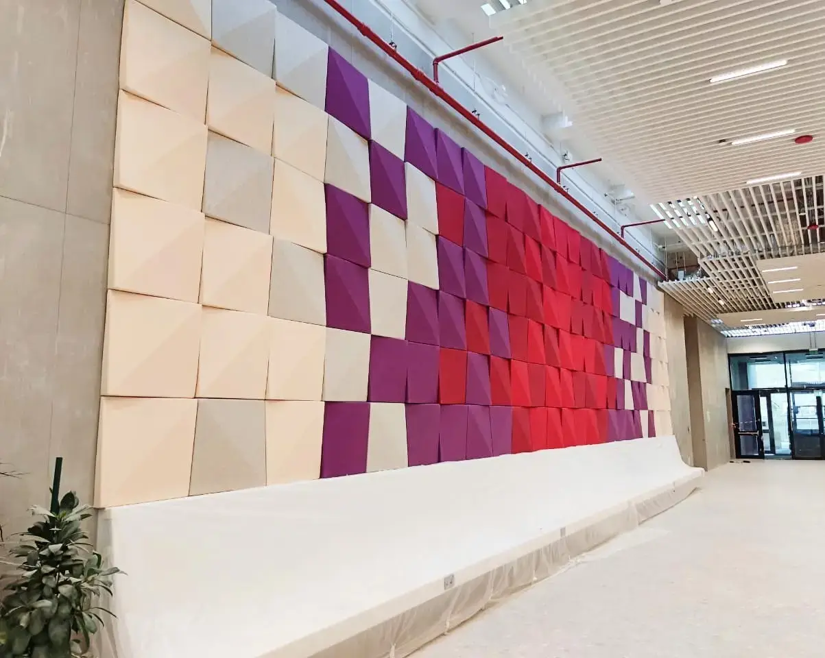 - Decrasound polyester panels in colourful education and workplace interiors.