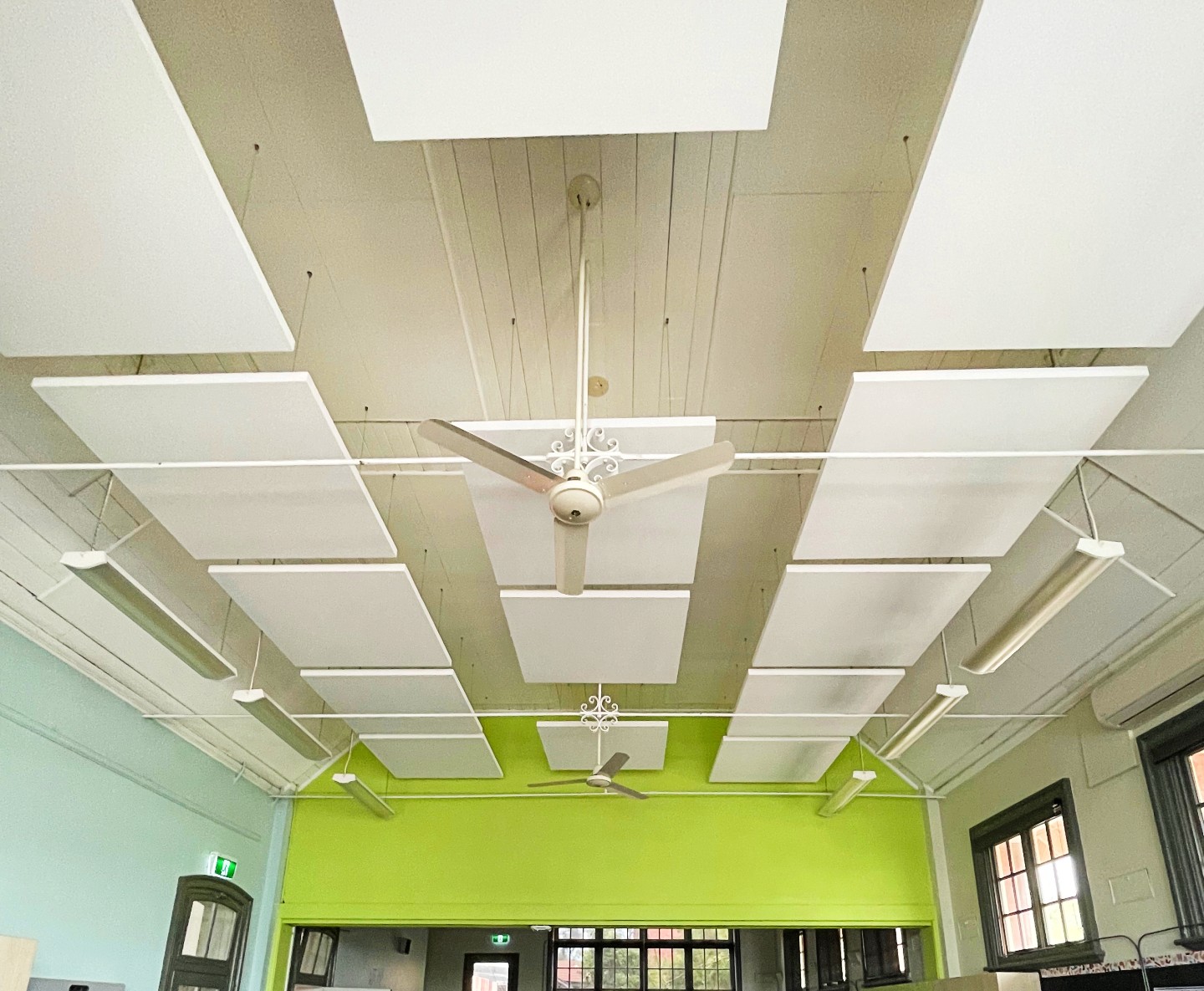 The room had limited wall space available for treatment, ruling out traditional wall-mounted panels. The teaching staff needed a solution that would reduce reverberation without taking up usable classroom space or disrupting the visual layout of the room.